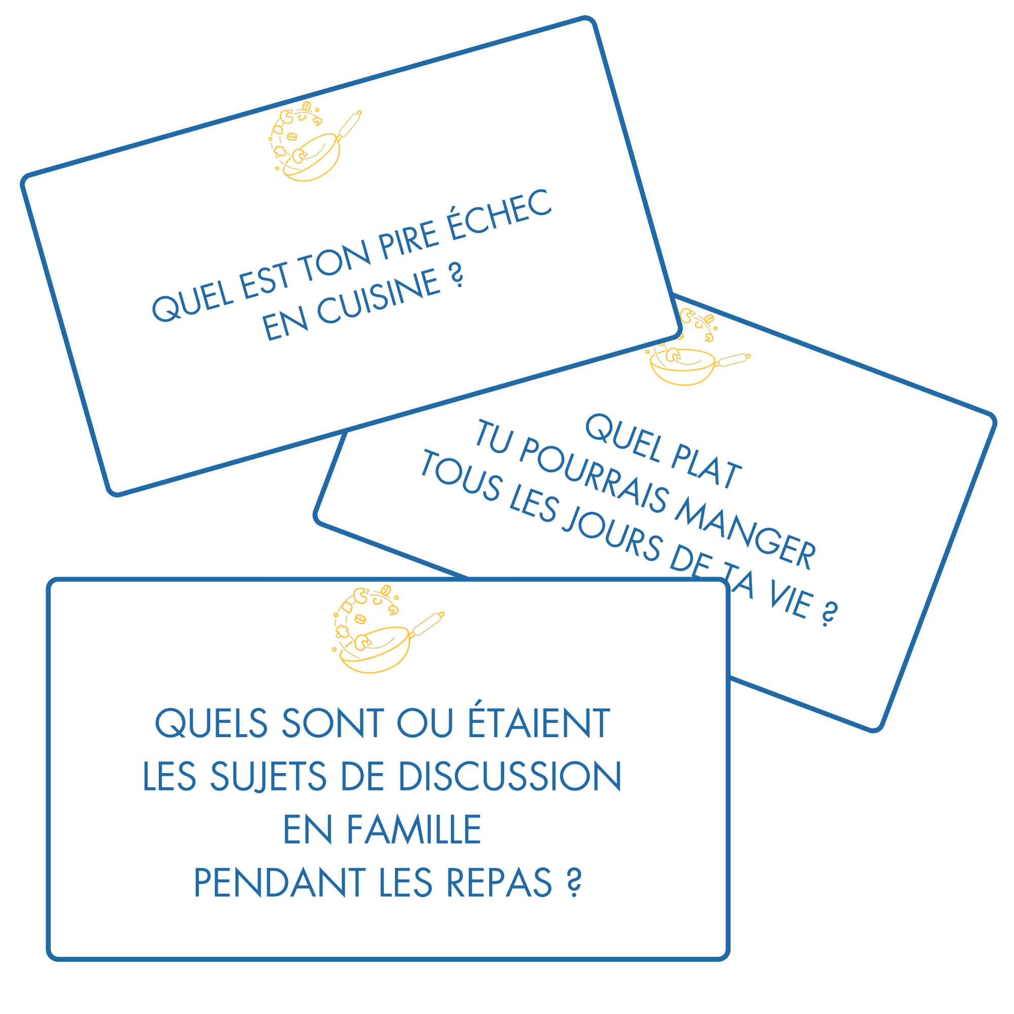 Cuisine & famille est un jeu de cartes questions conçu pour encourager la prise de parole autour de thématiques universelles : la nourriture, les souvenirs et les traditions familiales.