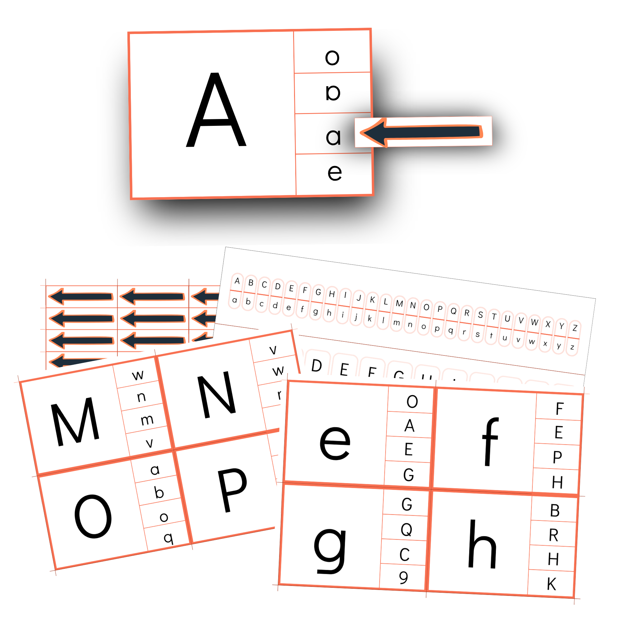 À partir d’une lettre donnée, l’apprenant doit retrouver sa correspondance et indiquer sa réponse à l’aide d’une flèche ou d’une pince à linge.